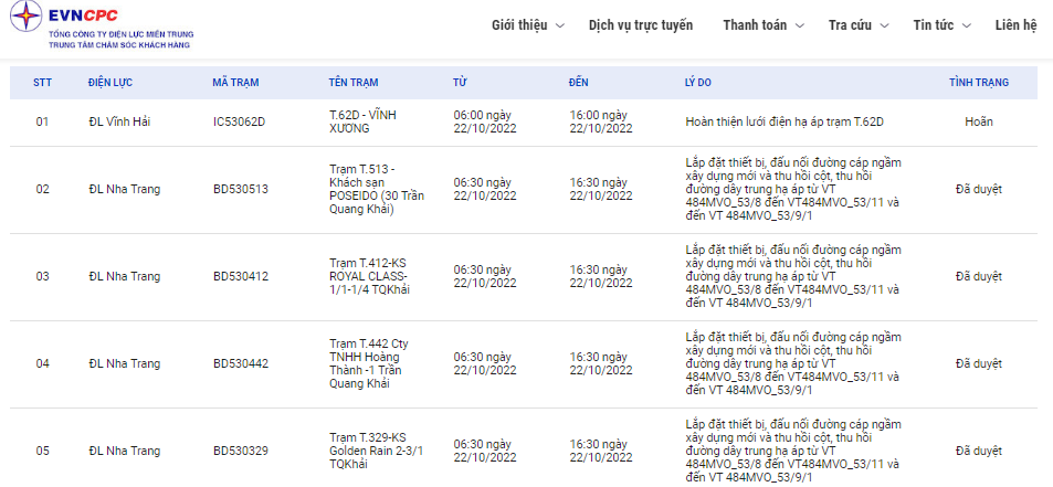 | 5 | ĐL Nha Trang | BD530329 | Trạm T.329-KS Golden Rain 2-3/1 TQKhải | 06:30 22/10/2022 | 16:30 22/10/2022 | Lắp đặt thiết bị, đấu nối đường cáp ngầm xây dựng mới và thu hồi cột, thu hồi đườngdây trung hạ áp từ VT 484MVO_53/8 đến VT484MVO_53/11 và đến VT 484MVO_53/9/1 | Đã duyệt |