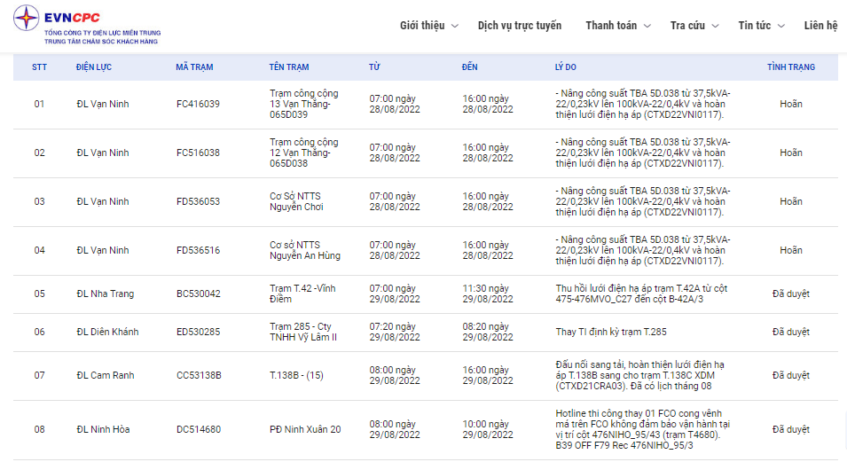 Lịch cắt điện Khánh Hòa ngày mai 28/8 trên website của EVNCPC. Ảnh: BNEWS