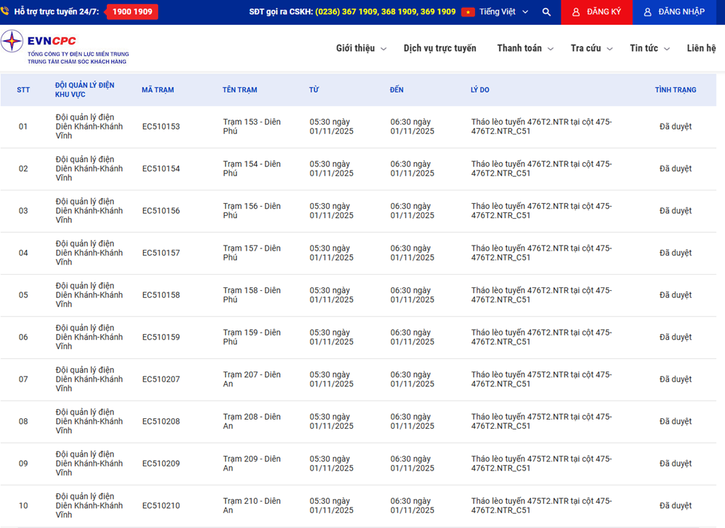 | 10 | Đội quản lý điện Diên Khánh-Khánh Vĩnh | EC510210 | Trạm 210 - Diên An | 05:30 01/11/2025 | 06:30 01/11/2025 | Tháo lèo tuyến 475T2.NTR tại cột 475-476T2.NTR_C51 | Đã duyệt |