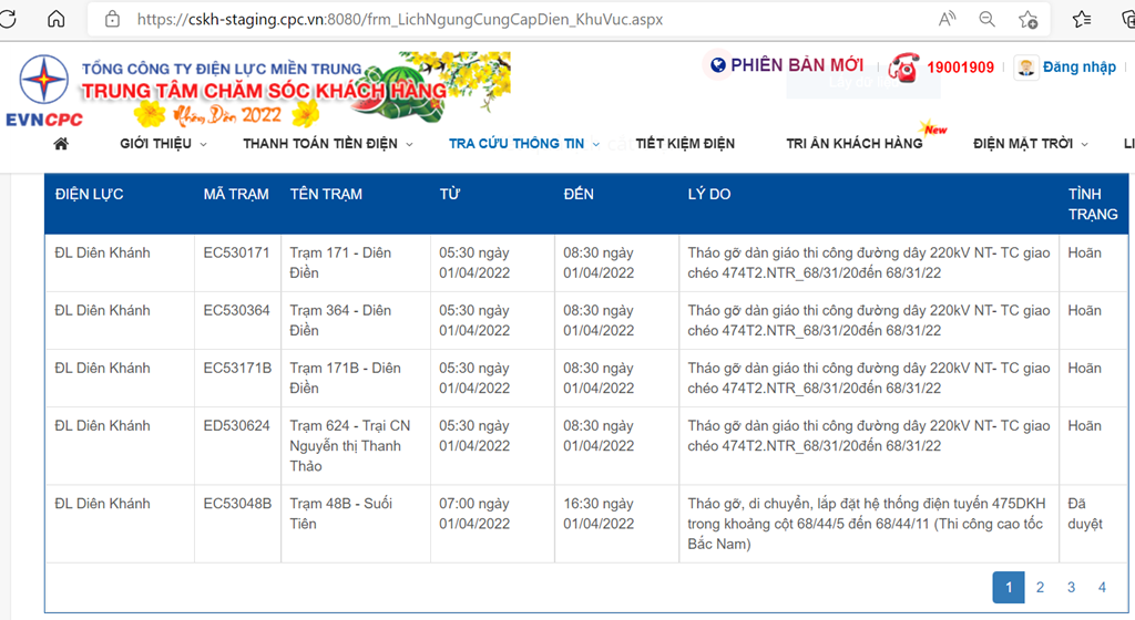 | ĐL Diên Khánh | EC53052C | Trạm 52C - Thị trấn DK | 08:00 ngày 01/04/2022 | 09:30 ngày 01/04/2022 | Thay LA tại trạm T.52C | Đã duyệt |