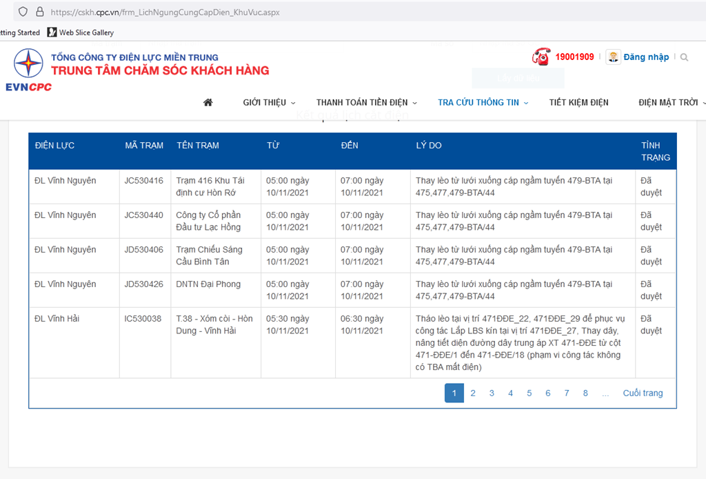 | ĐL Vĩnh Hải | ID530383 | CTY TNHH MTV Miền Trung & Tây Nguyên | 05:30 ngày 10/11/2021 | 06:30 ngày 10/11/2021 | Tháo lèo tại vị trí 471ĐĐE_22, 471ĐĐE_29 để phục vụ công tác Lắp LBS kín tại vị trí 471ĐĐE_27, Thay dây, nâng tiết diện đường dây trung áp XT 471-ĐĐE từ cột 471-ĐĐE/1 đến 471-ĐĐE/18 (phạm vi công tác không có TBA mất điện) | Đã duyệt |