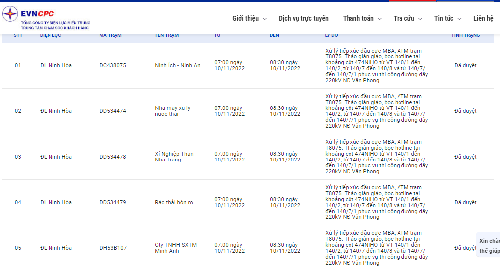 | ĐL Ninh Hòa | DH53B107 | Cty TNHH SXTM Minh Anh | 07:00 10/11/2022 | 08:30 10/11/2022 | Xử lý tiếp xúc đầu cực MBA, ATM trạm T8075.Tháo giàn giáo, bọc hotline tại khoảng cột 474NIHO từ VT 140/1 đến 140/2, từ 140/7 đến 140/8 và từ 140/7/ đến 140/7/1 phục vụ thi công đường dây 220kV NĐ Vân Phong | Đã duyệt |