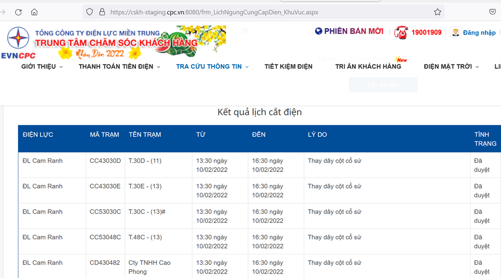 | ĐL Cam Ranh | CD430482 | Cty TNHH Cao Phong | 13:30 ngày 10/02/2022 | 16:30 ngày 10/02/2022 | Thay dây cột cổ sứ | Đã duyệt |