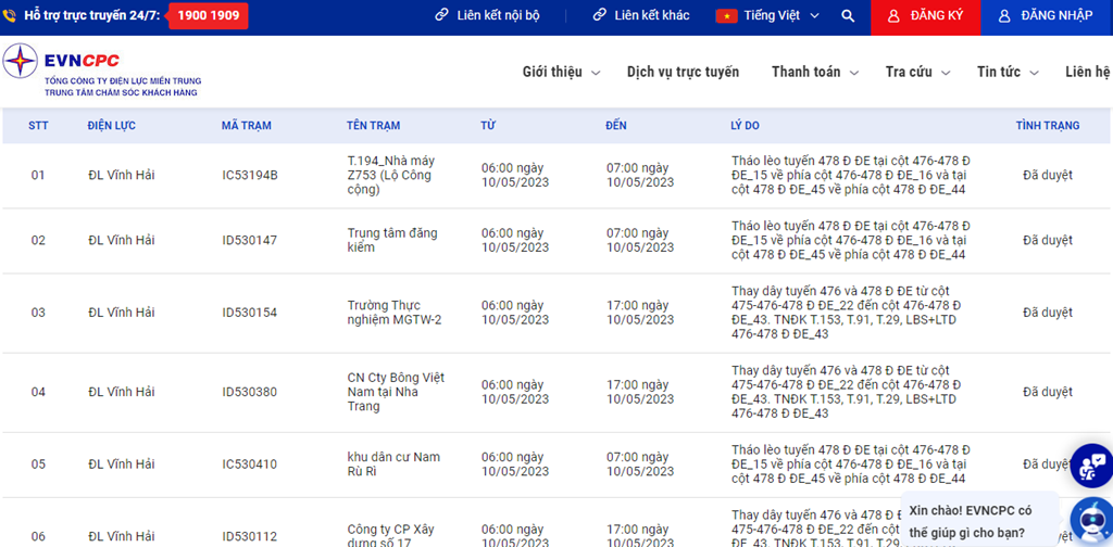 | 10 | ĐL Vĩnh Hải | ID53348B | Công ty Cổ phần Đông á | 06:00 10/05/2023 | 17:00 10/05/2023 | Thay dây tuyến 476 và 478 Đ ĐE từ cột 475-476-478 Đ ĐE_22 đến cột 476-478 Đ ĐE_43.TNĐK T.153, T.91, T.29, LBS+LTD 476-478 Đ ĐE_43 | Đã duyệt |