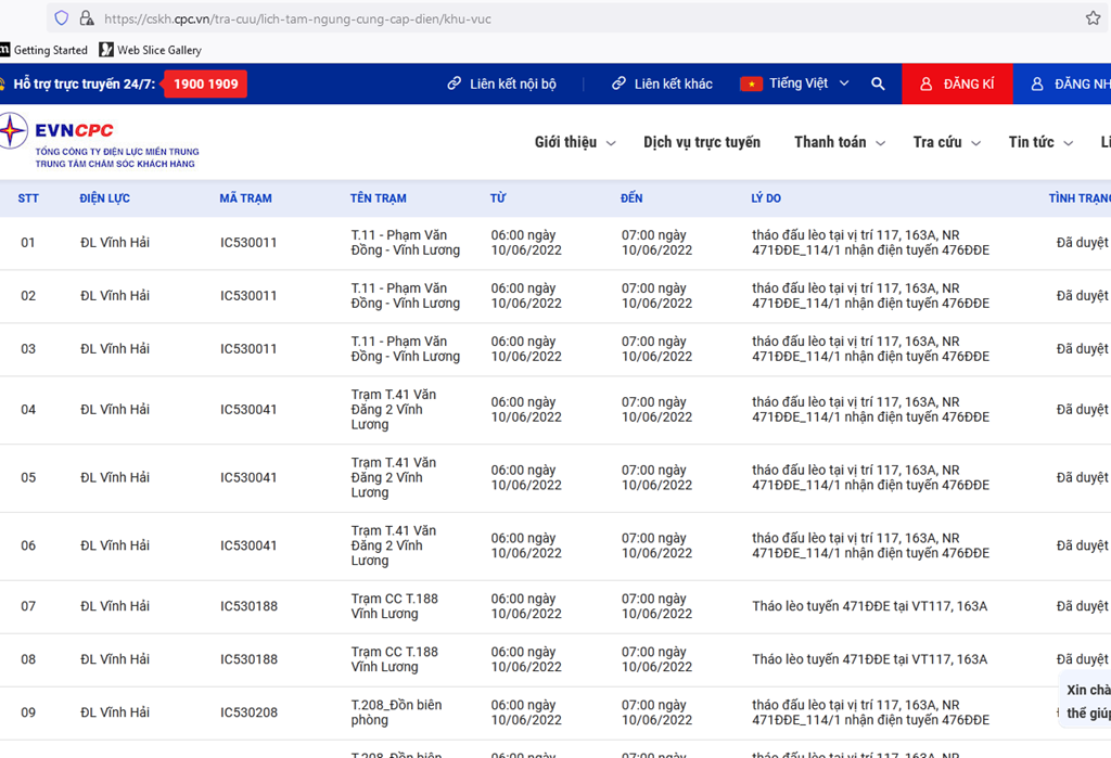 | 7 | ĐL Vĩnh Hải | IC530188 | Trạm CC T.188 Vĩnh Lương | 06:00 10/06/2022 | 07:00 10/06/2022 | Tháo lèo tuyến 471ĐĐE tại VT117, 163A | |