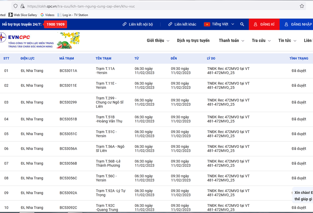 | 10 | ĐL Nha Trang | BC53092C | Trạm T.92C -Quang Trung | 06:30 11/02/2023 | 09:30 11/02/2023 | TNĐK Rec 472MVO tại VT 481-472MVO_25 | Đã duyệt |