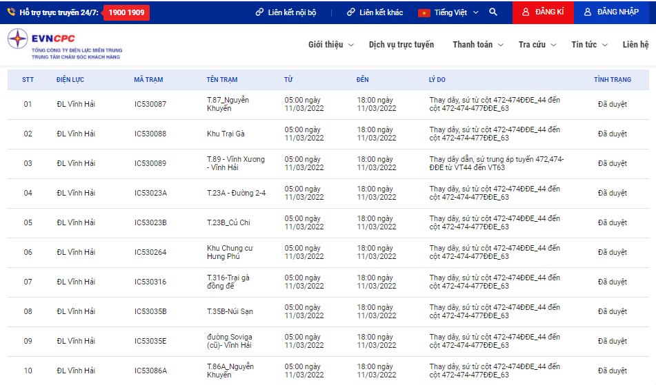 Lịch cắt điện Khánh Hòa ngày mai 11/3 trên website của EVNCPC. Ảnh: BNEWS