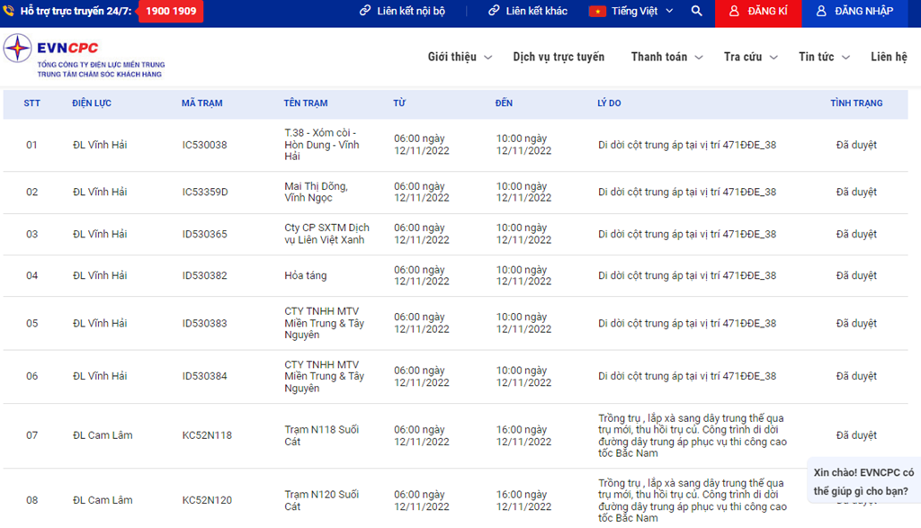 | 6 | ĐL Vĩnh Hải | ID530384 | CTY TNHH MTV Miền Trung & Tây Nguyên | 06:00 12/11/2022 | 10:00 12/11/2022 | Di dời cột trung áp tại vị trí 471ĐĐE_38 | Đã duyệt |