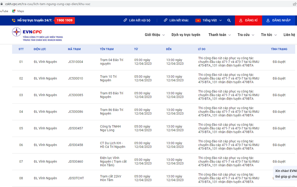 | 2 | ĐL Vĩnh Nguyên | JC530010 | Trạm 10 Trí Nguyên | 05:00 12/04/2023 | 13:00 12/04/2023 | Thi công đào rút cáp phục vụ công tác chuyển đầu cáp 471-7 và 473-7 tại tủ RMU 475-BTA_131 nhận điện tuyến 479BTA | Đã duyệt |