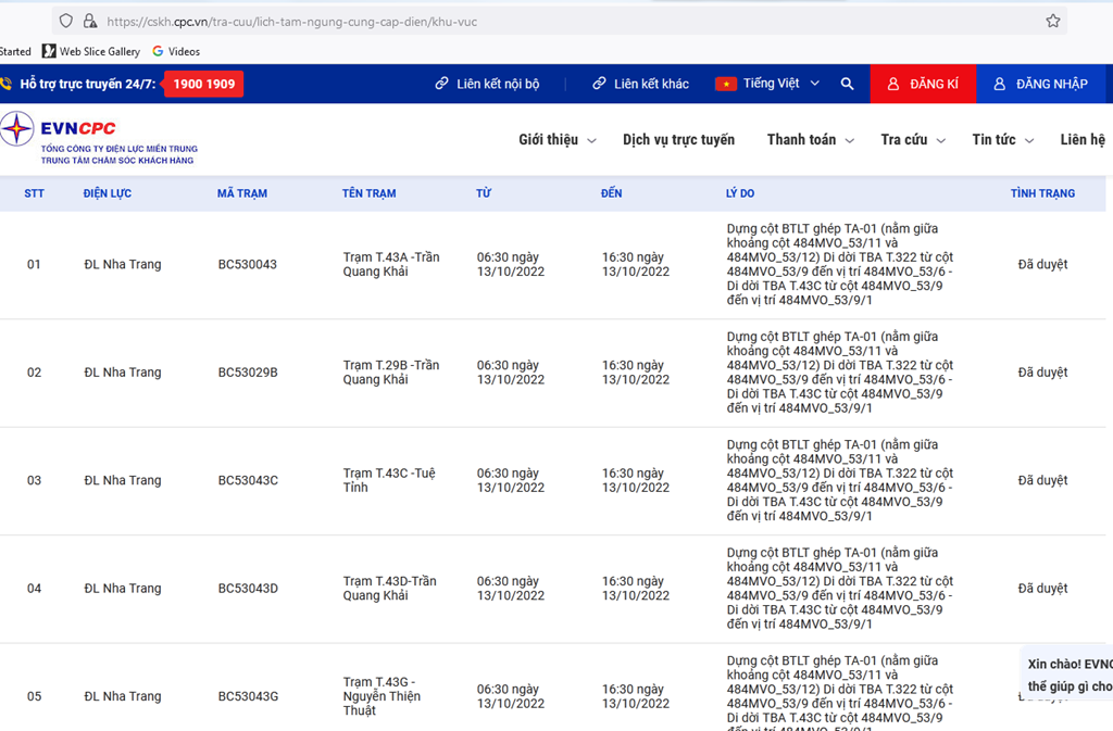 Lịch cắt điện Khánh Hòa ngày mai 13/10 trên website của EVNCPC cập nhật ngày 12/10. Ảnh: BNEWS
