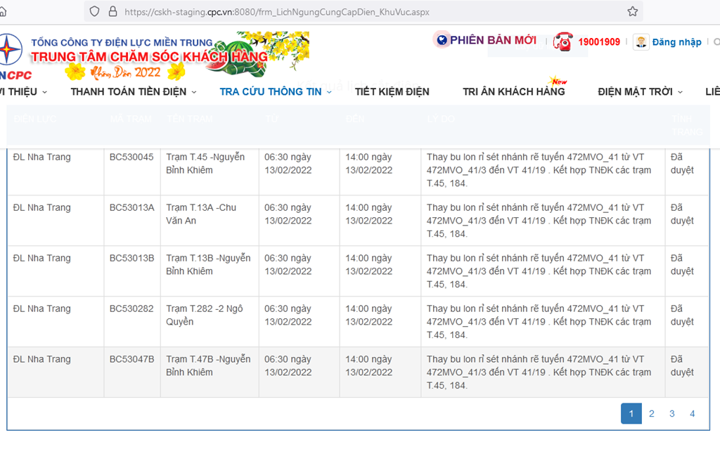 | ĐL Nha Trang | BD530129 | Trạm T.129 Chi cục Thuế Tỉnh | 06:30 ngày 13/02/2022 | 14:00 ngày 13/02/2022 | Thay bu lon rỉ sét nhánh rẽ tuyến 472MVO_41 từ VT 472MVO_41/3 đến VT 41/19 . Kết hợp TNĐK các trạm T.45, 184. | Đã duyệt |