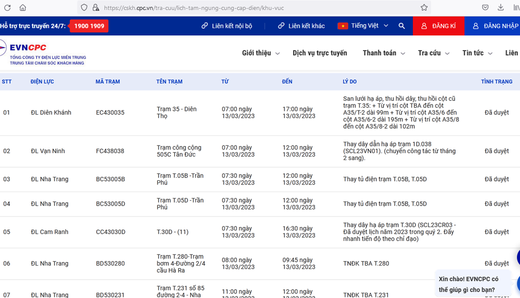 | 5 | ĐL Cam Ranh | CC43030D | T.30D - (11) | 07:30 13/03/2023 | 16:30 13/03/2023 | Thay dây hạ áp trạm T.30D (SCL23CR03 - Đã duyệt lịch năm 2023 trong quý 2. Đẩy nhanh tiến độ theo chỉ đạo) | Đã duyệt |