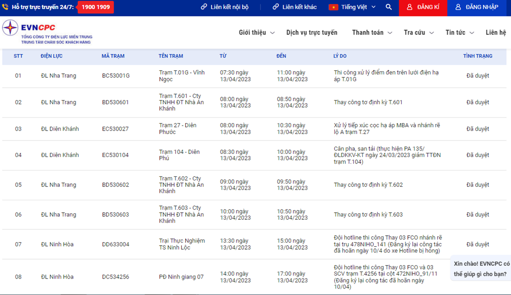 | 2 | ĐL Nha Trang | BD530601 | Trạm T.601 - Cty TNHH ĐT Nhà An Khánh | 08:00 13/04/2023 | 08:50 13/04/2023 | Thay công tơ định kỳ T.601 | Đã duyệt |