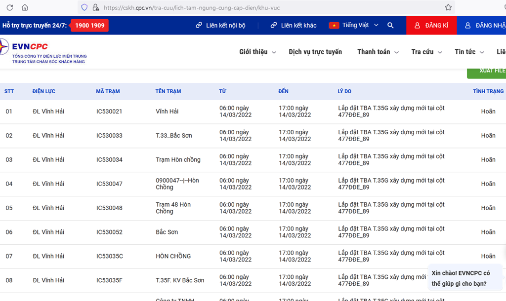 | 6 | ĐL Vĩnh Hải | ID530302 | Công ty TNHH Thương mại và dịch vụ Chánh Bổn | 06:00 14/03/2022 | 17:00 14/03/2022 | Lắp đặt TBA T.35G xây dựng mới tại cột 477ĐĐE_89 | Hoãn |