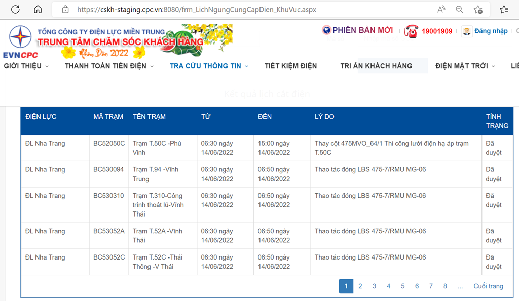 | ĐL Nha Trang | BD530550 | Trạm T.550 - Khu đô thị Phúc Khánh 1 | 15:00 ngày 14/06/2022 | 15:20 ngày 14/06/2022 | Thao tác cắt LBS 475-7/RMU MG-06 | Đã duyệt |