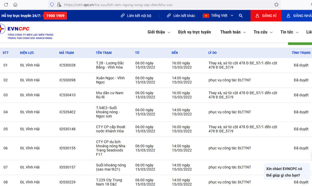 Để theo dõi lịch cắt điện tại tỉnh Khánh Hòa, người dân có thể truy cập: https://cskh.cpc.vn/frm_LichNgungCungCapDien_KhuVuc.aspx