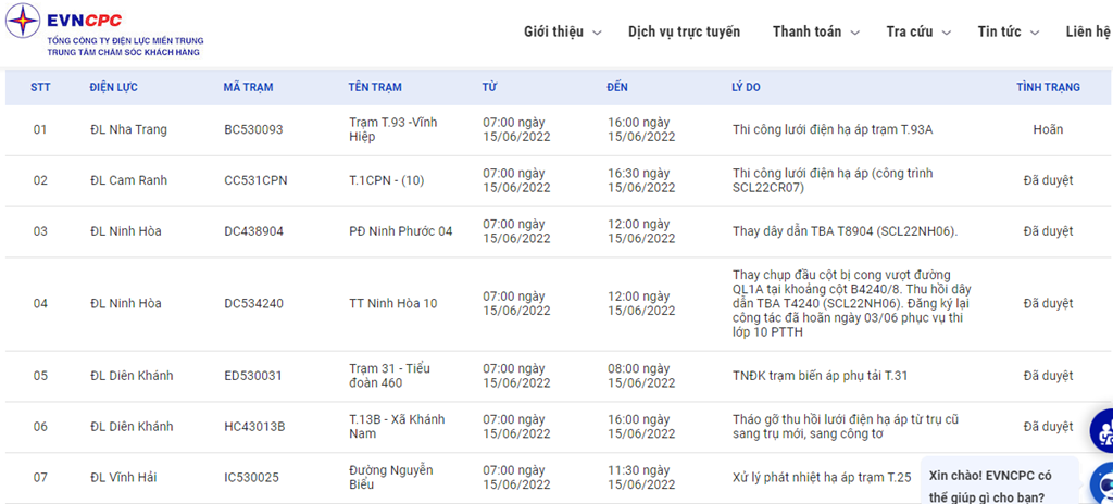 Lịch cắt điện Khánh Hòa ngày 15/6 cập nhật lúc 11h00 ngày 14/6 tại website EVNCPC. Ảnh: BNEWS