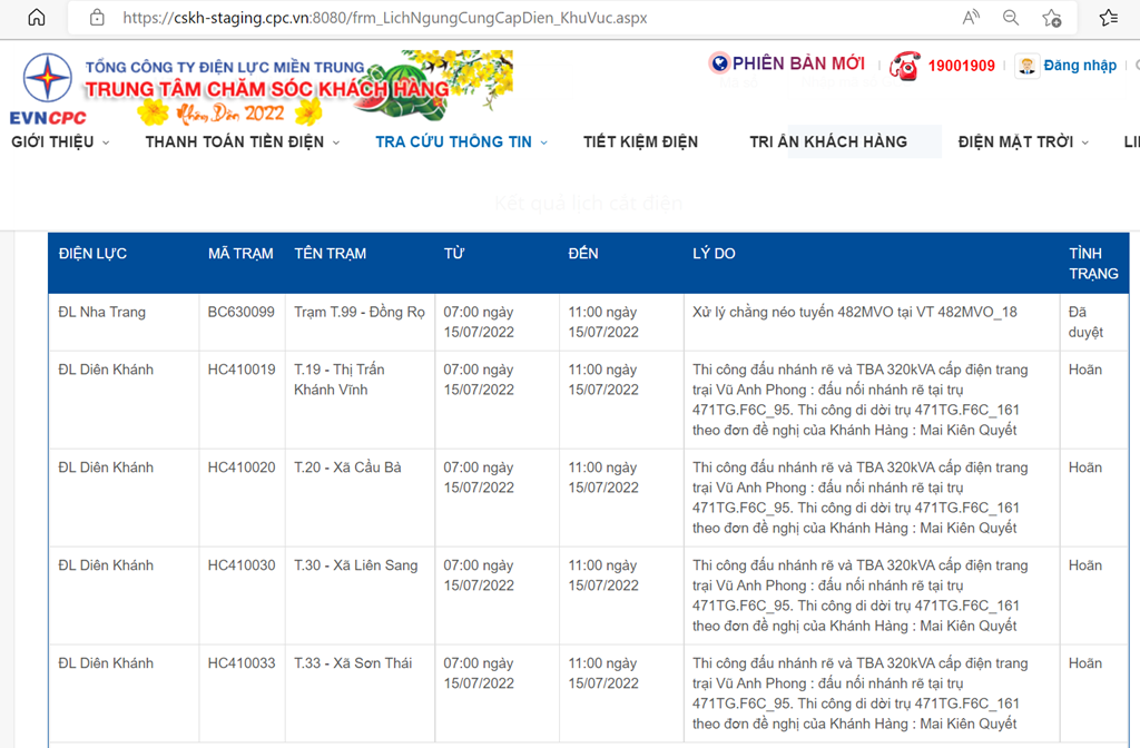 | ĐL Diên Khánh | EC530030 | Trạm 30 - Diên Toàn | 08:00 ngày 15/07/2022 | 11:00 ngày 15/07/2022 | Hoán chuyển MBA giữa T.238 & T.30 (Theo QĐ 968/QĐ-ĐLKH ngày 15/6/2022) | Hoãn |