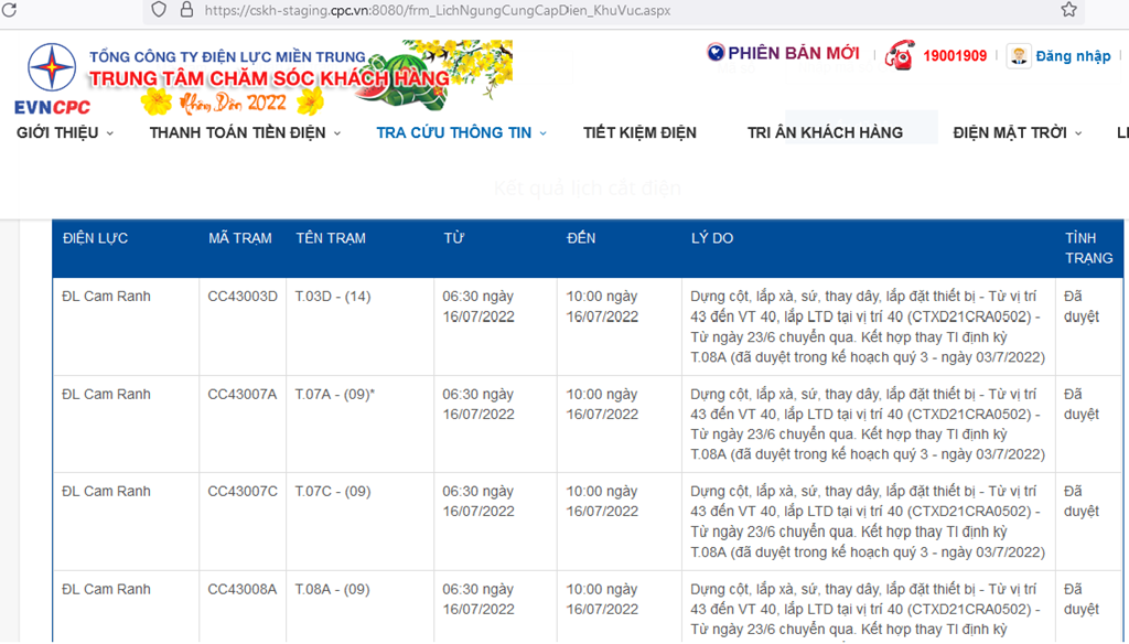 | ĐL Cam Ranh | CC43008A | T.08A - (09) | 06:30 ngày 16/07/2022 | 10:00 ngày 16/07/2022 | Dựng cột, lắp xà, sứ, thay dây, lắp đặt thiết bị - Từ vị trí 43 đến VT 40, lắp LTD tại vị trí 40 (CTXD21CRA0502) - Từ ngày 23/6 chuyển qua. Kết hợp thay TI định kỳ T.08A (đã duyệt trong kế hoạch quý 3 - ngày 03/7/2022) | Đã duyệt |