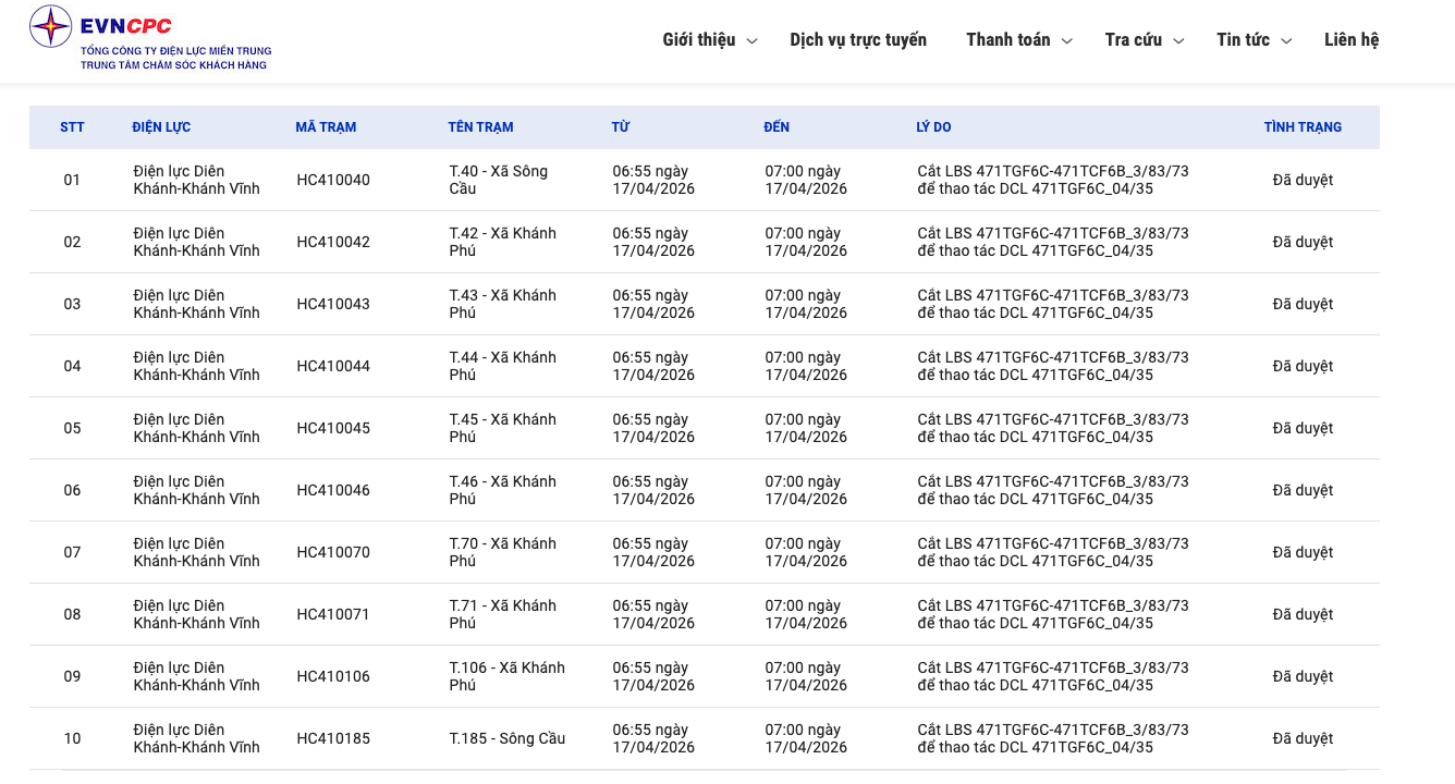 | Điện lực Diên Khánh-Khánh Vĩnh | HC410042 | T.42 - Xã Khánh Phú | 06:55 17/04/2026 | 07:00 17/04/2026 | Cắt LBS 471TGF6C-471TCF6B_3/83/73 để thao tác DCL 471TGF6C_04/35 | Đã duyệt |