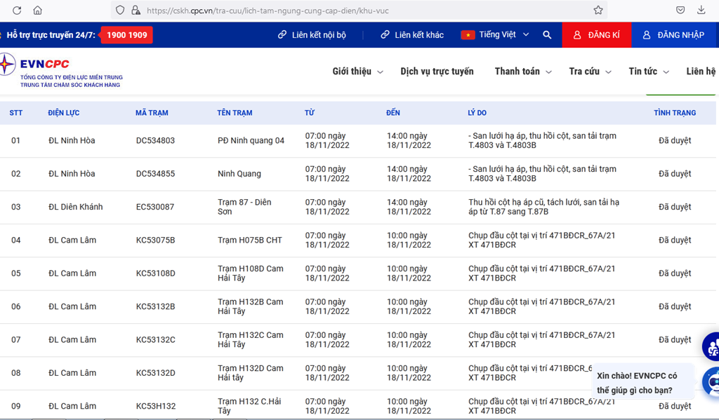 | 7 | ĐL Cam Lâm | KC53132C | Trạm H132C Cam Hải Tây | 07:00 18/11/2022 | 10:00 18/11/2022 | Chụp đầu cột tại vị trí 471BĐCR_67A/21 XT 471BĐCR | Đã duyệt |