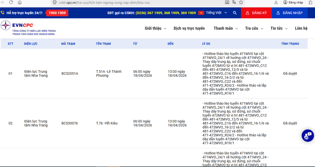 | Điện lực Trung tâm Nha Trang | BD530334 | Trạm T.334 Khách sạn Palace- ngay trạm T.34 | 06:00 18/04/2026 | 13:00 18/04/2026 | Phục vụ công tác thay dây tuyến 472MVO | Đã duyệt |