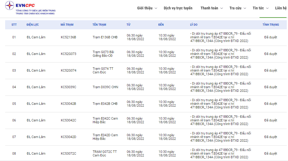 Lịch cắt điện Khánh Hòa ngày mai 18/8 trên website của EVNCPC. Ảnh: BNEWS