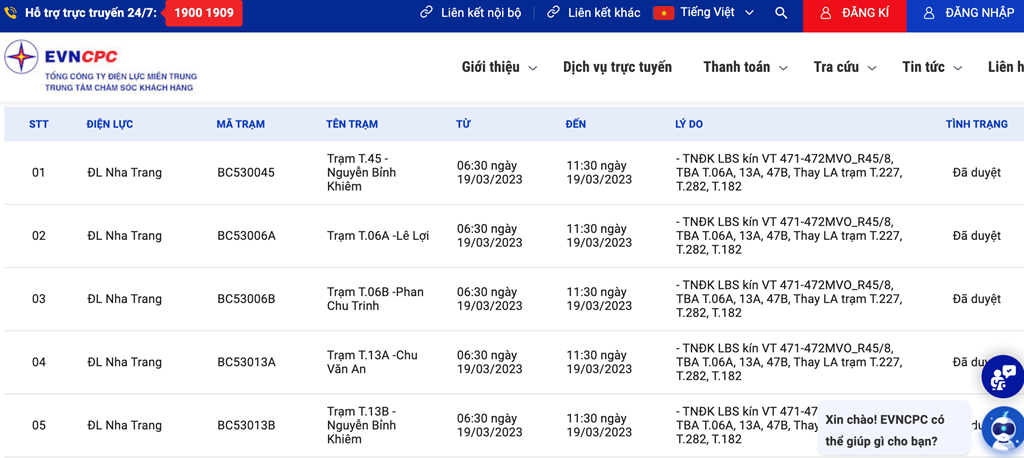 | 1 | ĐL Nha Trang | BC530045 | Trạm T.45 -Nguyễn Bỉnh Khiêm | 06:30 19/03/2023 | 11:30 19/03/2023 | - TNĐK LBS kín VT 471-472MVO_R45/8, TBA T.06A, 13A, 47B, Thay LA trạm T.227, T.282, T.182 | Đã duyệt |