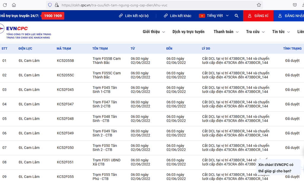 | 1 | ĐL Cam Lâm | KC52055B | Trạm F055B Cam Thành Bắc | 06:00 02/06/2022 | 06:03 02/06/2022 | Cắt DCL tại vị trí 473BĐCR_144 và chuyển lưới cấp điện 475CRA đến 473BĐCR_144 | |