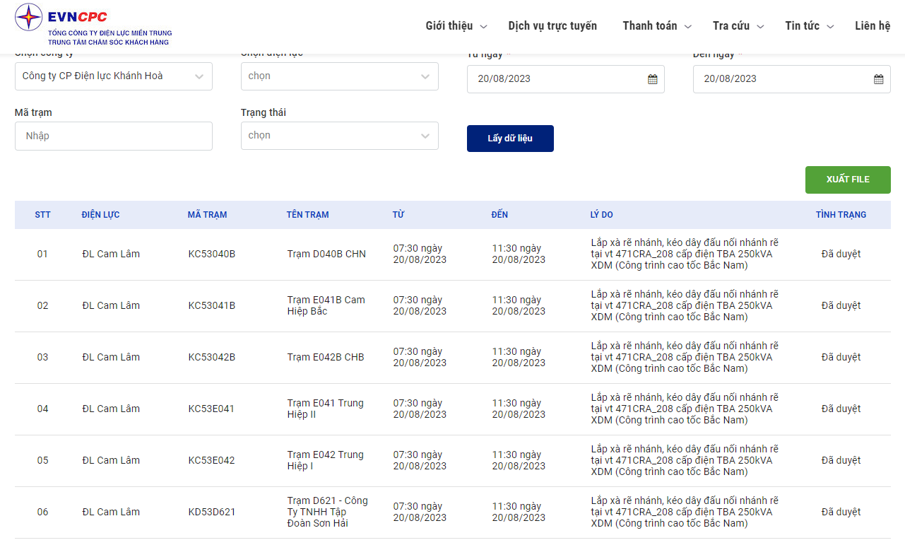 Lịch cắt điện Khánh Hòa 20/8 trên website của EVNCPC.