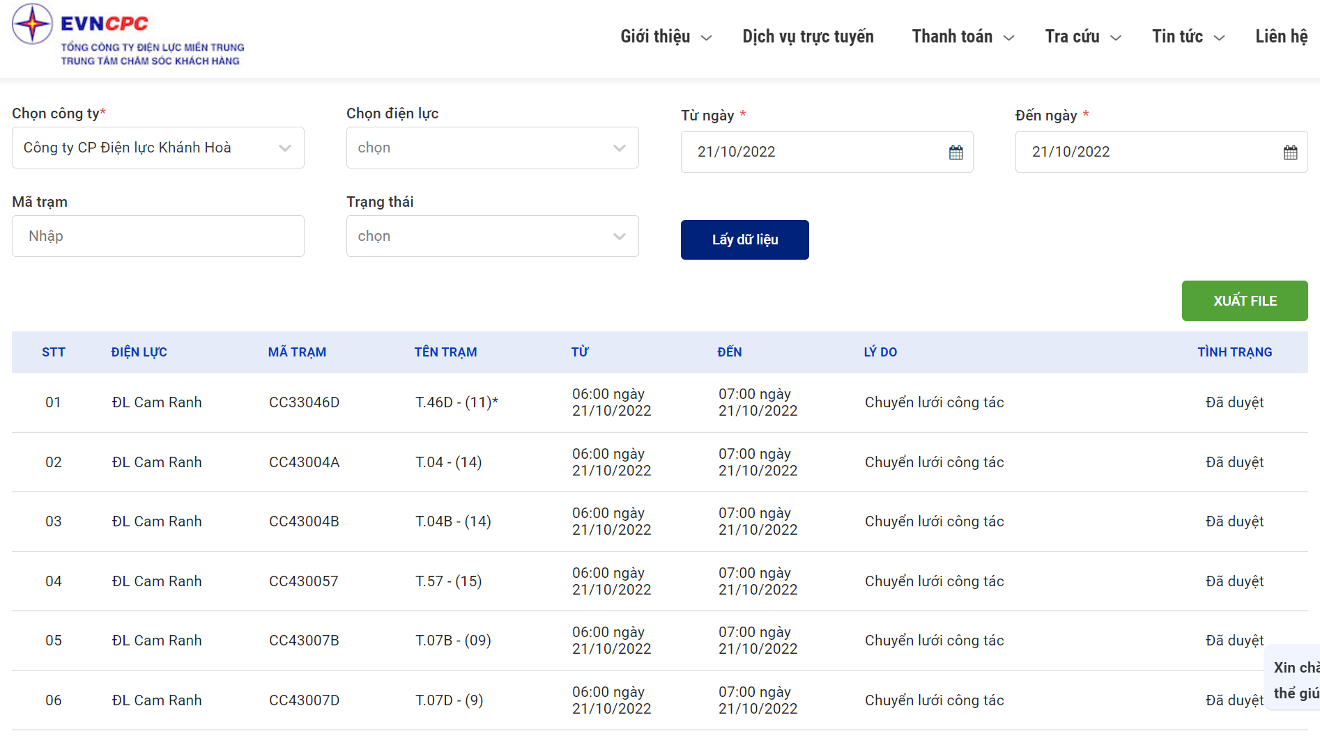 Lịch cắt điện Khánh Hòa ngày mai 21/10 trên website của EVNCPC cập nhật ngày 20/10. Ảnh: BNEWS