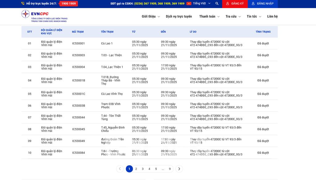 | 9 | Đội quản lý điện Vĩnh Hải | IC530049 | đường Đoàn Trần Nghiệp | 05:30 21/11/2025 | 17:00 21/11/2025 | Thay dây tuyến 472ĐĐE từ VT 93/3 đến VT 93/15 | Đã duyệt |