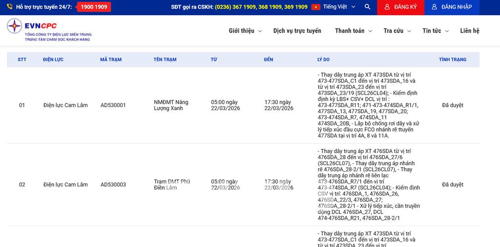 | 1 | Điện lực Cam Lâm | AD530001 | NMĐMT Năng Lượng Xanh | 05:00 22/03/2026 | 17:30 22/03/2026 | - Thay dây trung áp XT 473SDA từ vị trí 473-477SDA_C1 đến vị trí 473SDA_16 và từ vị trí 473SDA_23 đến vị trí 473SDA_23/19 (SCL26CL04);- Kiểm định định kỳ LBS+ CSV+ DCL vị trí : 473-477SDA_R11; 471-473-474SDA_R1/1, 477SDA_13, 477SDA_19, 477SDA_20; 473-474SDA_R7, 474SDA_11 474SDA_20B,- Lắp bộ chống rơi dây và xử lý tiếp xúc đầu cực FCO nhánh rẽ ttuyến 477SDA tại vị trí 4A, 8 và 11A. | Đã duyệt |