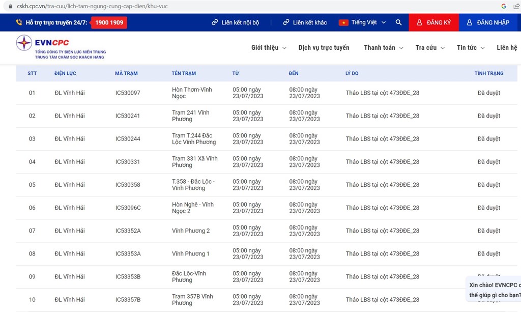 Lịch cắt điện Khánh Hòa ngày mai 23/7 trên website của EVNCPC cập nhật ngày 22/7. Ảnh: BNEWS