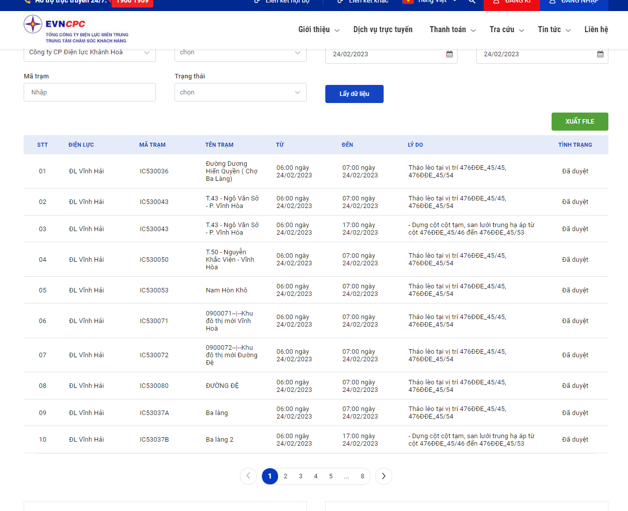 Lịch cắt điện Khánh Hòa ngày mai 24/2 trên website của EVNCPC cập nhật ngày 23/2. Ảnh: BNEWS