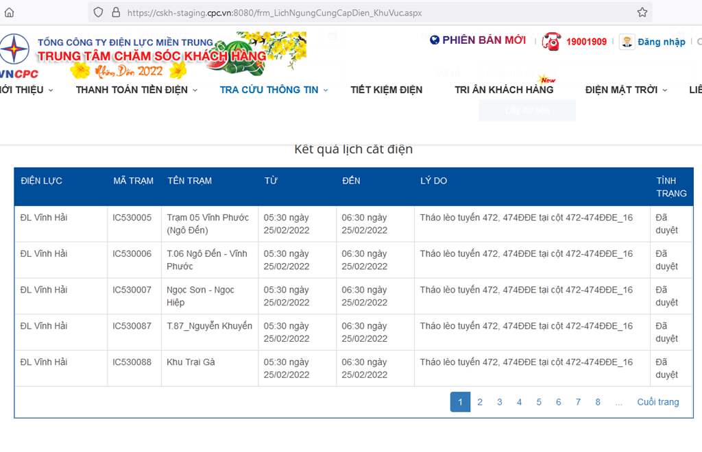 | ĐL Vĩnh Hải | IC530088 | Khu Trại Gà | 05:30 ngày 25/02/2022 | 06:30 ngày 25/02/2022 | Tháo lèo tuyến 472, 474ĐĐE tại cột 472-474ĐĐE_16 | Đã duyệt |