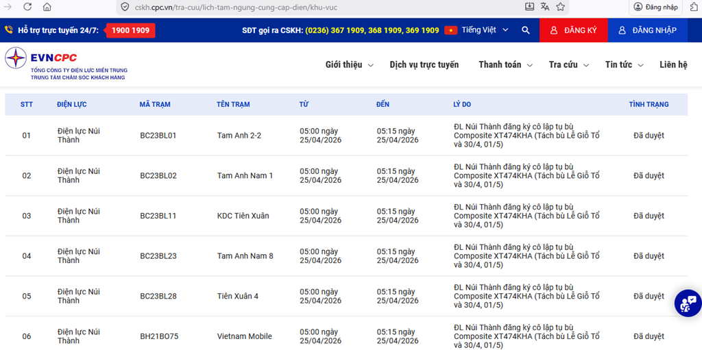 | ĐIỆN LỰC | MÃ TRẠM | TÊN TRẠM | TỪ | ĐẾN | LÝ DO | TÌNH TRẠNG |