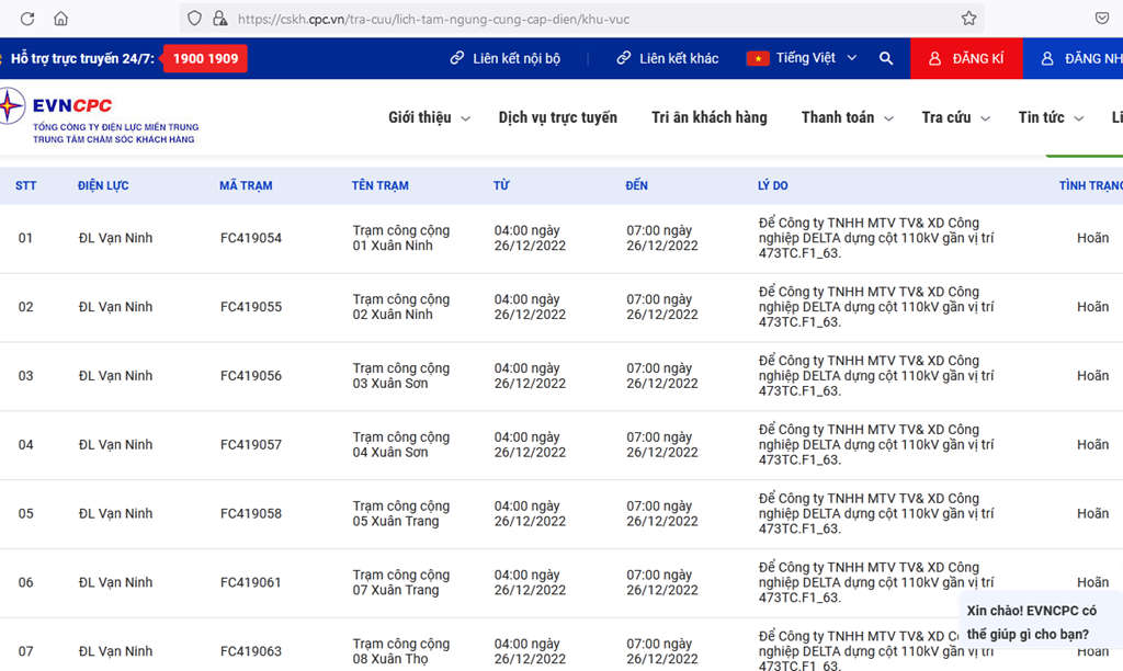 | 7 | ĐL Vạn Ninh | FC419063 | Trạm công cộng 08 Xuân Thọ | 04:00 26/12/2022 | 07:00 26/12/2022 | Để Công ty TNHH MTV TV& XD Công nghiệp DELTA dựng cột 110kV gần vị trí 473TC.F1_63. | Hoãn |