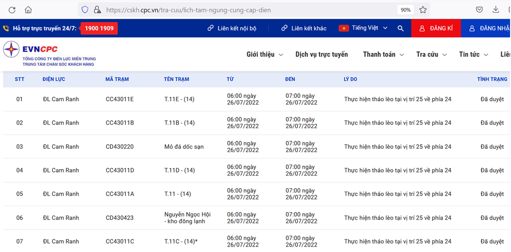 | 16 | ĐL Cam Ranh | CC43011B | T.11B - (14) | 07:00 26/07/2022 | 16:00 26/07/2022 | Dựng trụ, lắp đặt xà, sứ, thay dây từ vị trí 01 đến vị trí 24 - CTXD21CRA0502. dựng cột sắt tại vị trí 24 (Đã duyệt lịch quý 3, ngày 09/7/2022). Tháo lèo vị trí 25 về phía 24. | Đã duyệt |