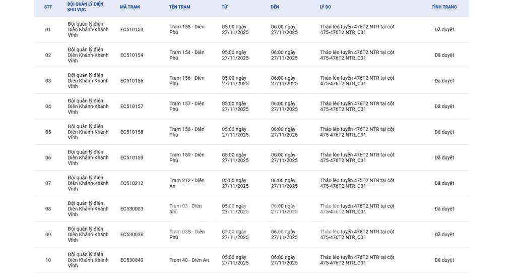 | 10 | Đội quản lý điện Diên Khánh-Khánh Vĩnh | EC530040 | Trạm 40 - Diên An | 05:00 27/11/2025 | 06:00 27/11/2025 | Tháo lèo tuyến 476T2.NTR tại cột 475-476T2.NTR_C31 | Đã duyệt |