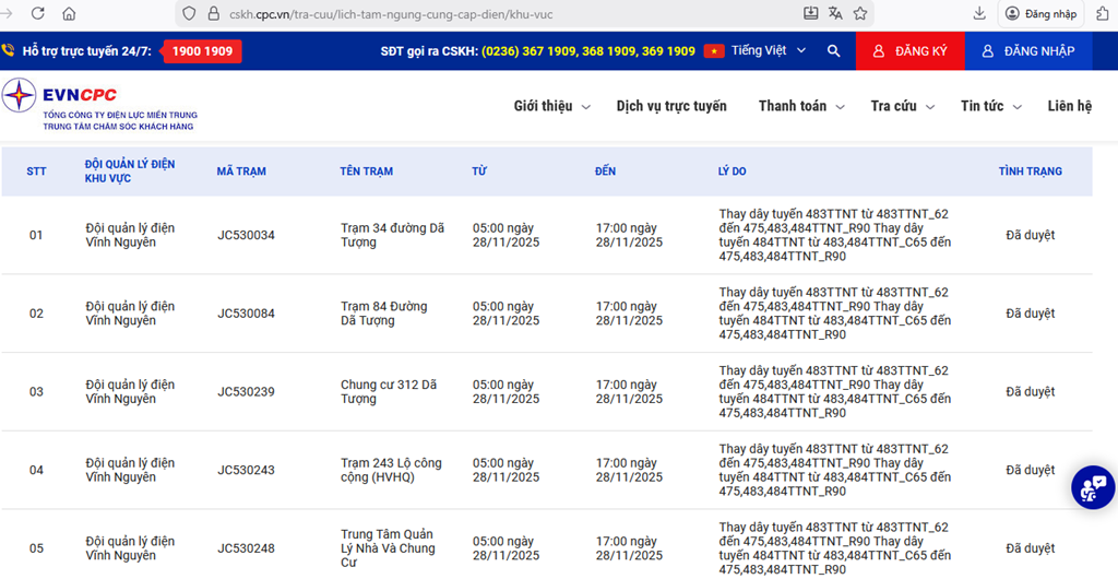 | Đội quản lý điện Vĩnh Nguyên | JD530376 | Chi Cục Đăng Kiểm Số 5 | 05:00 28/11/2025 | 17:00 28/11/2025 | Thay dây tuyến 483TTNT từ 483TTNT_62 đến 475,483,484TTNT_R90Thay dây tuyến 484TTNT từ 483,484TTNT_C65 đến 475,483,484TTNT_R90 | Đã duyệt |