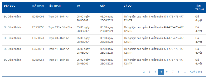 | ĐL Diên Khánh | EC510208 | Trạm 208 - Diên An | 05:00 ngày 28/08/2021 | 08:00 ngày 28/08/2021 | Thí nghiệm cáp ngầm 4 xuất tuyến 474-475-476-477 T2.NTR | Đã duyệt |