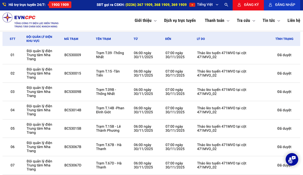 | 5 | Đội quản lý điện Trung tâm Nha Trang | BC53015B | Trạm T.15B - Lê Thành Phương | 06:00 30/11/2025 | 07:00 30/11/2025 | Tháo lèo tuyến 471MVO tại cột 471MVO_02 | Đã duyệt |