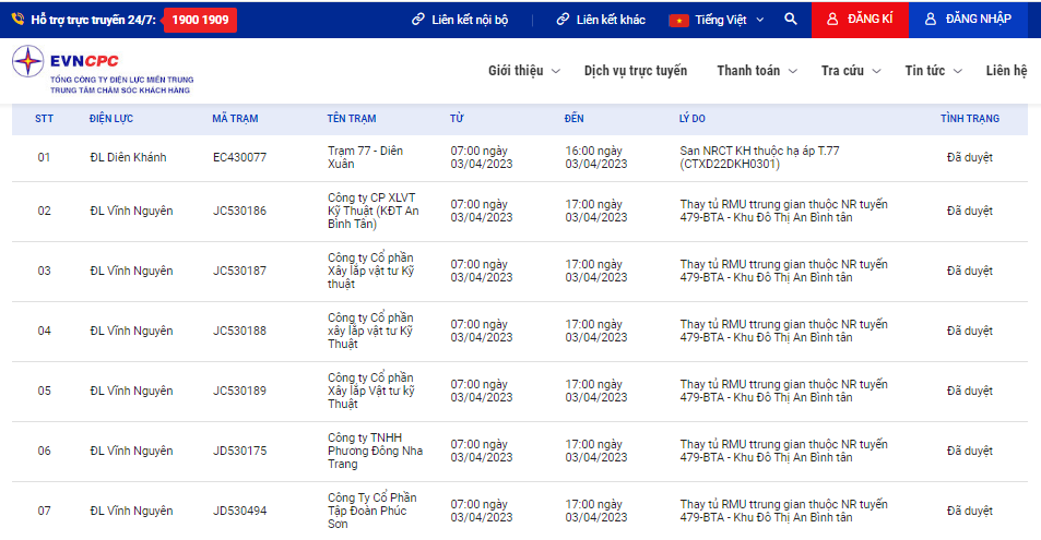 | ĐL Vĩnh Nguyên | JC530186 | Công ty CP XLVT Kỹ Thuật (KĐT An Bình Tân) | 07:00 03/04/2023 | 17:00 03/04/2023 | Thay tủ RMU ttrung gian thuộc NR tuyến 479-BTA - Khu Đô Thị An Bình tân |