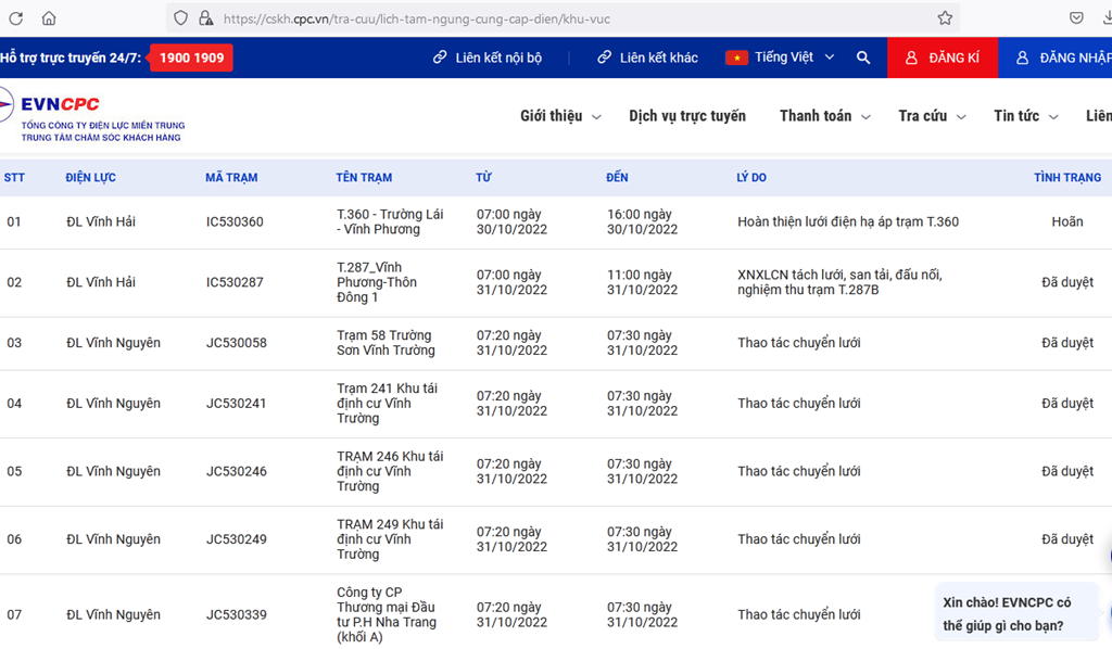 | 7 | ĐL Vĩnh Nguyên | JC530339 | Công ty CP Thương mại Đầu tư P.H Nha Trang (khối A) | 07:20 31/10/2022 | 07:30 31/10/2022 | Thao tác chuyển lưới | Đã duyệt |