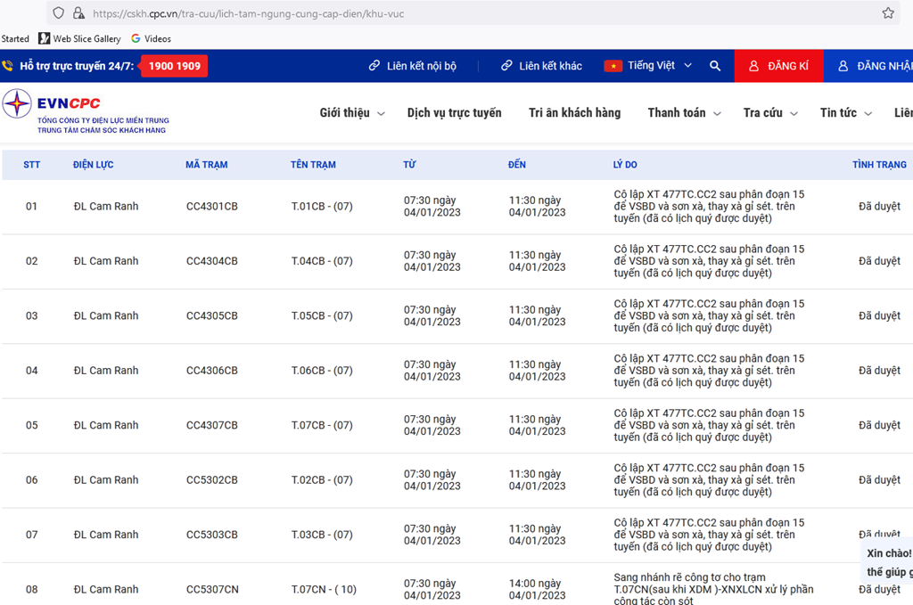 | 9 | ĐL Cam Ranh | CD41127H | Viettel Khánh Hoà - CN Tập đoàn VT Quân đội | 07:30 04/01/2023 | 11:30 04/01/2023 | Cô lập XT 477TC.CC2 sau phân đoạn 15 để VSBD và sơn xà, thay xà gỉ sét. trên tuyến (đã có lịch quý được duyệt) | Đã duyệt |