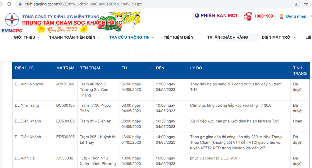 | ĐL Diên Khánh | EC530005 | Trạm 05 - Diên An | 08:00 ngày 04/05/2023 | 10:30 ngày 04/05/2023 | Xử lý tiếp xúc, cân pha lưới điện hạ áp tại trạm T.05 | Hoãn |