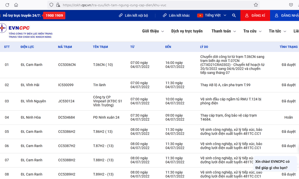 | 7 | ĐL Cam Ranh | CC5388H2 | T.88H2 - (13) | 08:00 04/07/2022 | 11:30 04/07/2022 | Vệ sinh công nghiệp, xử lý tiếp xúc, bảo dưỡng lưới điện xuất tuyến 481TC.CC1 | Đã duyệt |