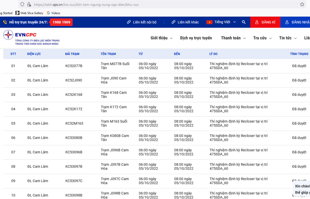 | 10 | ĐL Cam Lâm | KC53098B | Trạm J098B Cam Hòa | 06:00 05/10/2022 | 08:00 05/10/2022 | Thí nghiệm định kỳ Recloser tại vị trí 475SDA_60 | Đã duyệt |