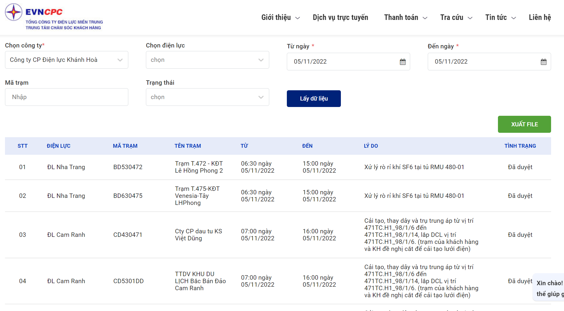 | 1 | ĐL Nha Trang | BD530472 | Trạm T.472 - KĐT Lê Hồng Phong 2 | 06:30 05/11/2022 | 15:00 05/11/2022 | Xử lý rò rỉ khí SF6 tại tủ RMU 480-01 | Đã duyệt |
